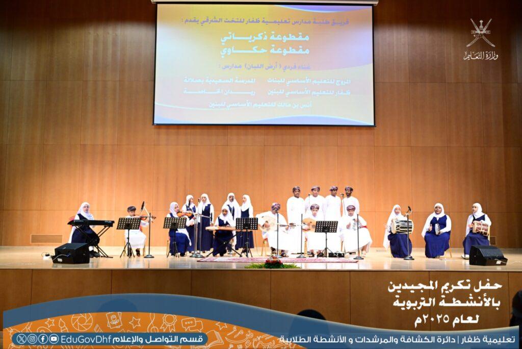 وتضمن الحفل فقرات فنية متنوعة من تقديم طلبة مدارس تعليمية ظفار من التخت الشرقي، وهي: مقطوعة “ذكرياتي”، ومقطوعة “حكواتي”، والغناء الفردي “أرض اللبان”، بالإضافة إلى عرض مرئي جسد مسيرة المجيدين وإنجازاتهم، وفقرة فنية تراثية عكست الموروث الثقافي.