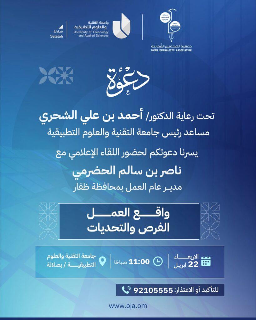 تنظم جمعية الصحفيين العمانية بمحافظة ظفار، بالتعاون مع جامعة التقنية والعلوم التطبيقية (فرع صلالة) يوم الأربعاء في حرم الجامعة لقاءً حواريًا مفتوحًا يجمع ناصر بن سالم الحضرمي، مدير عام المديرية العامة للعمل بمحافظة ظفار، مع الإعلاميين وطلبة كليات الجامعة والمهتمين بقطاع العمل، وذلك في صلالة.