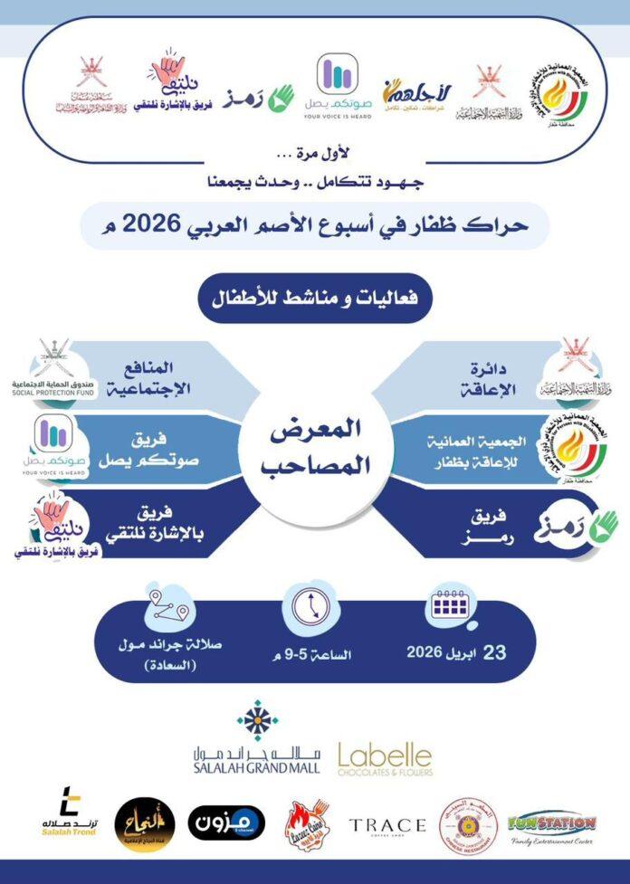 شهدت محافظة ظفار ختام فعاليات “حراك ظفار في أسبوع الأصم العربي 2026″، والذي أتى كبادرة نوعية تهدف إلى تعزيز الدمج المجتمعي وتسليط الضوء على قدرات وإبداعات فئة الصم، وذلك بتنظيم الجمعية العُمانية للأشخاص ذوي الإعاقة بمحافظة ظفار و بمشاركة تجسد تكامل الجهود بين المؤسسات الحكومية والفرق التطوعية والقطاع الخاص.