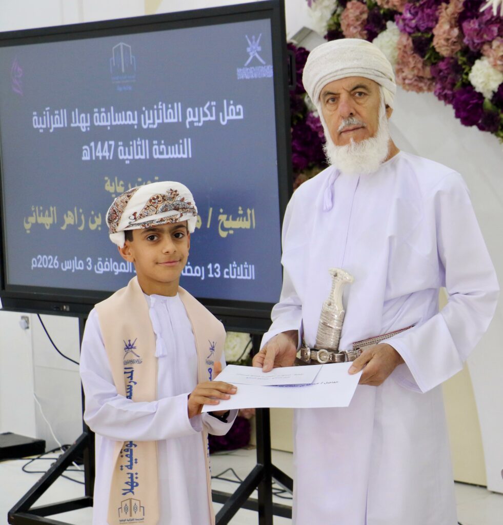 رعى الشيخ محمد بن عبدالله بن زاهر الهنائي حفل المدرسة القرآنية الوقفية بولاية بهلاء لتكريم الفائزين في النسخة الثانية من مسابقة بهلاء القرآنية لعام 1447هـ، التي أقيمت بتنظيم المدرسة القرآنية الوقفية ببهلاء وفريق بهلاء التطوعي، بالتعاون مع مكتب الأوقاف والشؤون الدينية ببهلاء، وذلك بحضور سعادة الشيخ سعيد بن علي بن أحمد النعيمي والي بهلاء، وسعادة الشيخ عمر بن علي الجنيبي عضو مجلس الشورى ممثل ولاية بهلاء، وعبدالرحمن بن سعيد العبري مدير مكتب الأوقاف والشؤون الدينية ببهلاء، وأعضاء المجلس البلدي، وجمع من الشيوخ والرشداء والمسؤولين وأولياء أمور حفظة كتاب الله. وأقيمت الاحتفالية في قاعة استراحة أبو جيفر بمنطقة حي السعد ببهلاء.