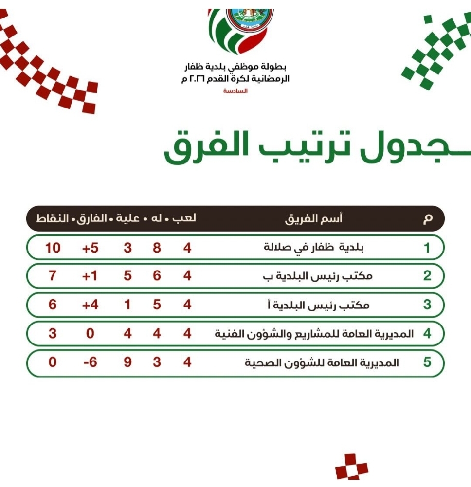 ووفقاً لجدول الترتيب النهائي مع ختام الجولة السادسة، فقد أحكم فريق بلدية ظفار في صلالة قبضته على المركز الأول برصيد 10 نقاط، محققاً سجلاً خالياً من الهزائم في مبارياته الأربع، وبفارق أهداف بلغ (+5). وحلّ فريق مكتب رئيس البلدية (ب) في الوصافة برصيد 7 نقاط، فيما جاء فريق مكتب رئيس البلدية (أ) في المركز الثالث بـ6 نقاط، واقتنص فريق المديرية العامة للمشاريع والشؤون الفنية البطاقة الرابعة للنصف النهائي برصيد 3 نقاط، بينما غادر فريق المديرية العامة للشؤون الصحية المنافسات من الدور الأول.