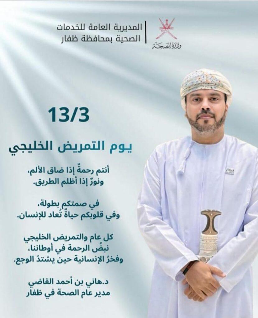 وثمّن مدير عام الخدمات الصحية بظفار الدور الذي تقوم به الكوادر التمريضية في مختلف المؤسسات الصحية بالمحافظة، مؤكداً أن هذه المناسبة تمثل فرصة لتجديد التقدير والاعتزاز بإسهاماتهم البارزة في دعم القطاع الصحي وتعزيز مسيرة التنمية الصحية في سلطنة عُمان.