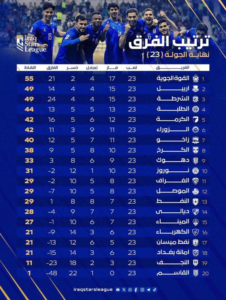أسدل الستار أخيراً على منافسات الجولة الثالثة والعشرين من “دوري نجوم العراق” لكرة القدم، لتتضح معالم المنافسة بشكل جلي بعد انتهاء كافة المباريات المؤجلة وتساوي جميع الأندية بـ (23) مباراة لُعبت. وقد أفرزت هذه الجولة عن مشهد تنافسي مثير، حيث واصل نادي القوة الجوية، تحت القيادة الفنية المحنكة للكابتن رشيد جابر، التحليق وحيداً في صدارة الترتيب العام، مؤكداً نواياه الجادة في معانقة اللقب هذا الموسم بفضل الاستقرار الفني والنتائج الإيجابية المتتالية.