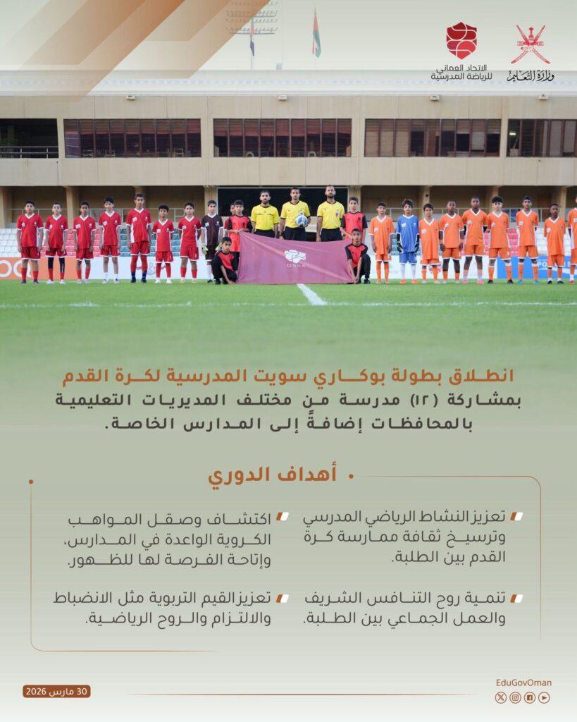 تقام مساء اليوم الاثنين أربعة مباريات هامة في إطار الجولة الثانية من دوري بوكاري سوِت المدرسي لكرة القدم والذي ينظمه الاتحاد العماني للرياضة المدرسية بالتعاون مع محلات وصيدلية مسقط العلامة التجارية بوكاري سوِت.
