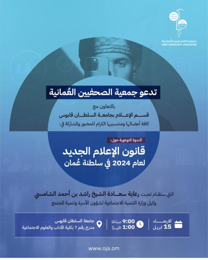 تنظم جمعية الصحفيين العُمانية، بالتعاون مع قسم الإعلام بكلية الآداب والعلوم الاجتماعية في جامعة السلطان قابوس، ندوة متخصصة تستعرض مضامين قانون الإعلام الجديد لعام 2024، وذلك في إطار جهودها الرامية إلى تعزيز الثقافة القانونية لدى العاملين في القطاع الإعلامي.
