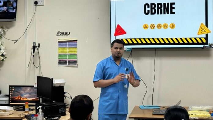 نظّم قسم إدارة الطوارئ والمخاطر الصحية بالمديرية العامة للخدمات الصحية بمحافظة ظفار محاضرة توضيحية متخصصة حول آليات التعامل مع حوادث المواد الخطرة (CBRNE)، وذلك في إطار الجهود الرامية إلى تعزيز منظومة الاستجابة للحوادث الطارئة ذات المخاطر المتعددة.