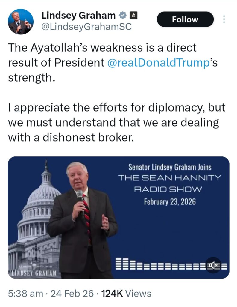 وذكر غراهام في تغريدته أن «ضعف آية الله هو نتيجة مباشرة لقوة الرئيس دونالد ترامب»، في إشارة إلى الهجمات الأمريكية على إيران – و التي نفذتها الولايات المتحدة فجر يوم 22 يونيو2025، ضمن عملية عسكرية أسمتها عملية مطرقة منتصف الليل (بالإنجليزية Operation Midnight Hammer) استهدفت منشآت نووية إيرانية في كل من منشأة فردو لتخصيب اليورانيوم، ومنشأة نطنز النووية، وأصفهان- ، مضيفاً أنه يثمّن المساعي الدبلوماسية، لكنه أشار في الوقت ذاته إلى ما وصفه بـ«التعامل مع وسيط غير نزيه» ، في تعبير اعتبره مراقبون انتقاداً ضمنياً لمسار الوساطة.